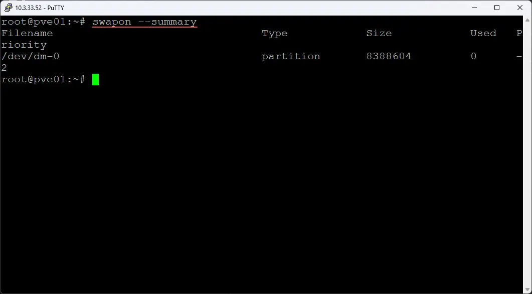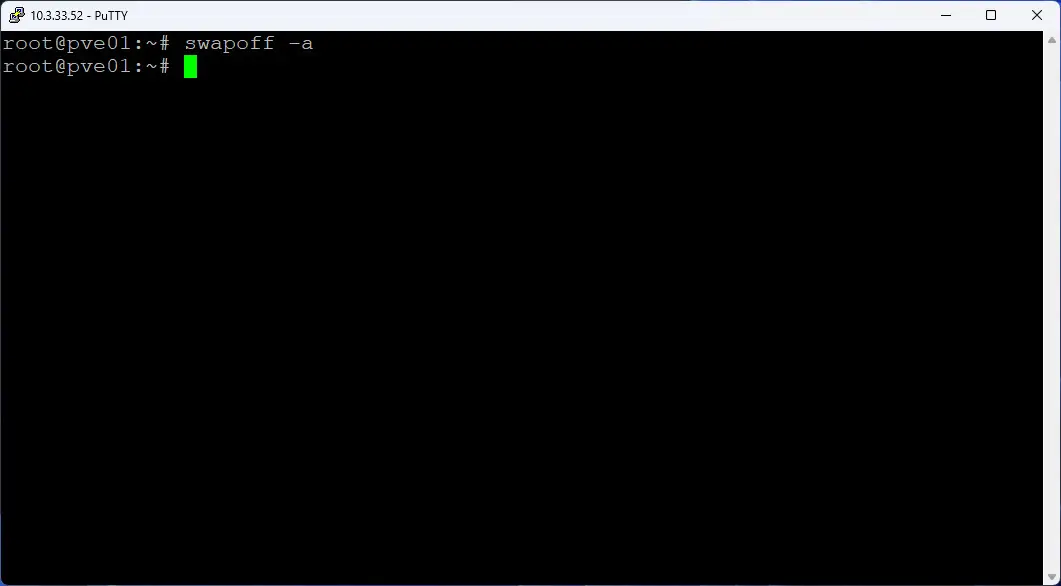 This command will say that any swap space that is currently configured we want to turn it off. Since we only have the default Proxmox swap space configured, this is fine as we want to turn this off and assign some fast dedicated storage for this purpose.