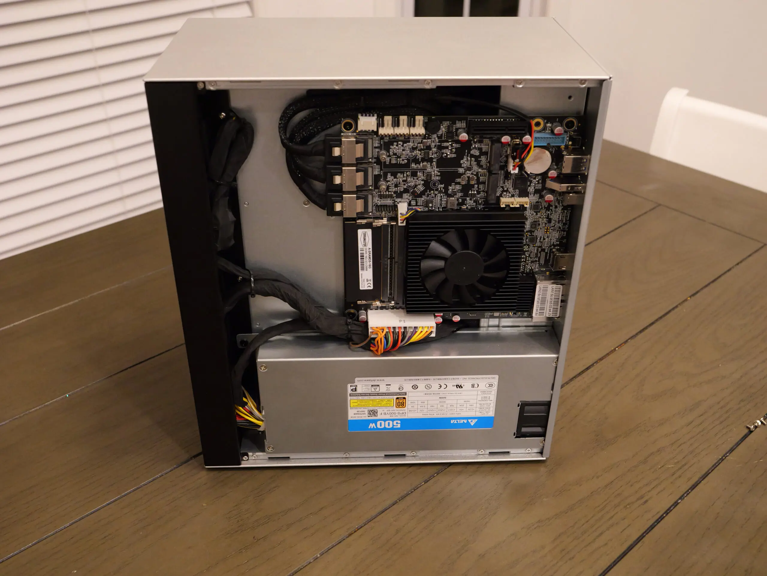 After removing three screws on the end towards the back of the device, you gain access to the motherboard and where the backplane plugs in as well as RAM and M.2 slots for adding NVMe drives.