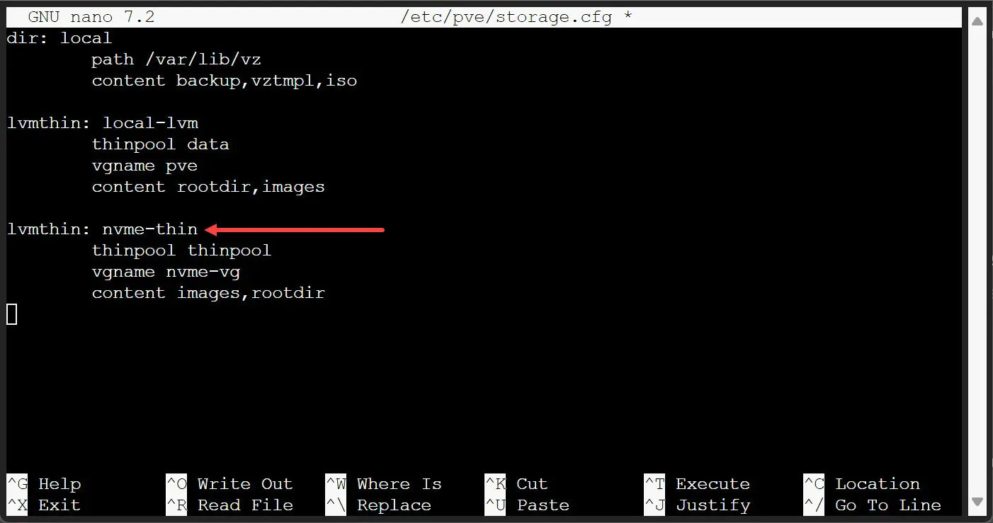 Now that we have the storage created, we need to add this new LVM-thin storage to Proxmox by modifying our storage configuration file. That file is located here: /etc/pve/storage.cfg.