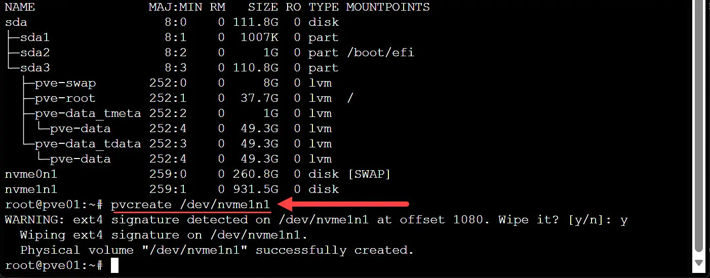Next, we need to take the steps to initialize the NVMe drive as a physical volume. To do that, run this command using the identifier of your NVMe drive you want to work with from the output of the lsblk command: