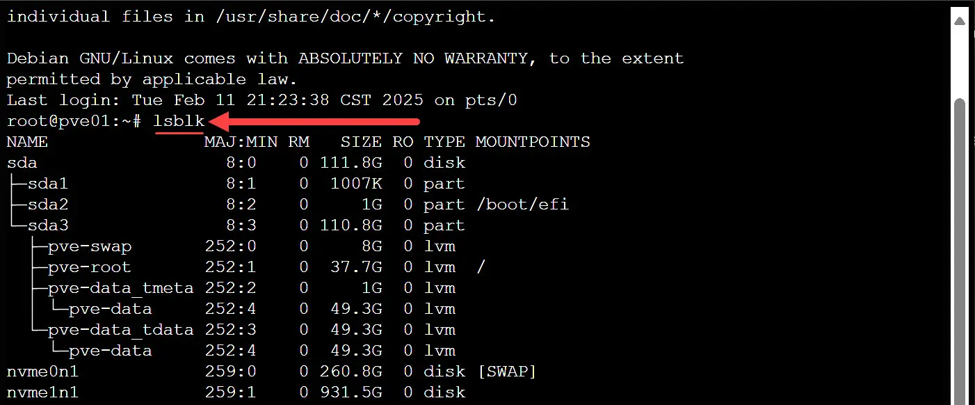 I will be working with the NVMe storage listed as nvme1n1 in the following examples. You will need to replace the commands below with the name of your particular NVMe storage as it is listed in Proxmox with the lsblk command.