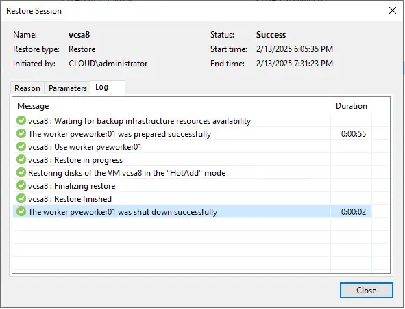 It took it a while to restore the VCSA appliance as it was around 250 GB on disk of data to move over. The mini PC that I used as a target also only has 2.5 GbE networking, so no 10 gig restore bandwidth.