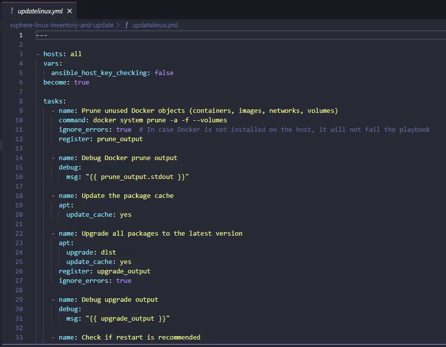 I currently use Ansible for many things in the home lab. One project I have is using Ansible in conjunction with CI/CD in GitLab to get a list of all Linux virtual machines in my VM inventory and then using that list to target for an Ansible playbook to run Linux updates.