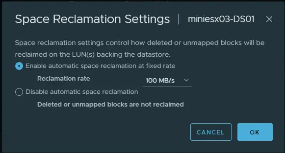 esxcli storage vmfs reclaim config set -l <DatastoreName> -e true
