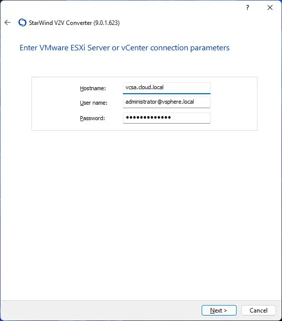 Next, we enter the credentials for the source environment. Below we are using a vCenter Server connection as the source environment connection.