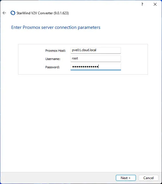 Like the source environment, we need to enter the connection information for the connection to Proxmox.