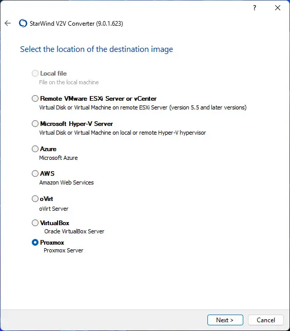 Next, we select the target environment. The options for this are the same minuse the P2V option. Also, local file is not available at this step either. Here I am targeting a Proxmox VE Server.