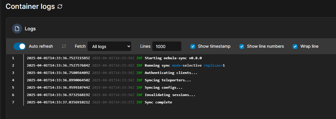 After you run your docker-compose up -d command, it is a good idea to check your Nebula-sync container logs to make sure you don’t see any errors listed.