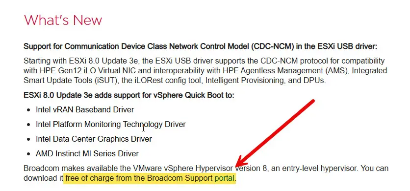 “Broadcom makes available the VMware vSphere Hypervisor version 8, an entry-level hypervisor. You can download it free of charge from the Broadcom Support portal.”