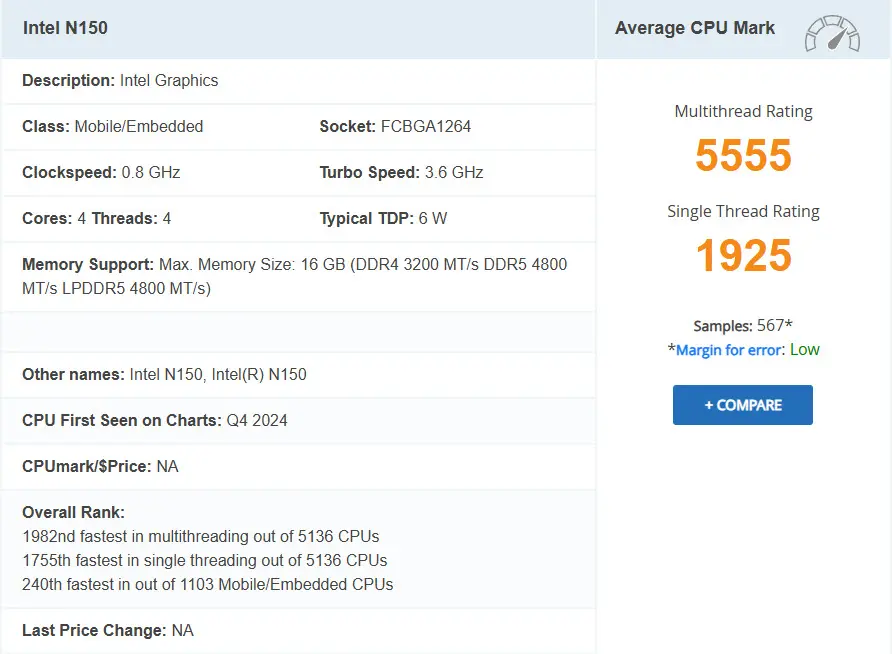 Below, you can see the benchmarks from “cpubenchmark.com”. You can check these out for yourself here: Intel N150 Benchmark.