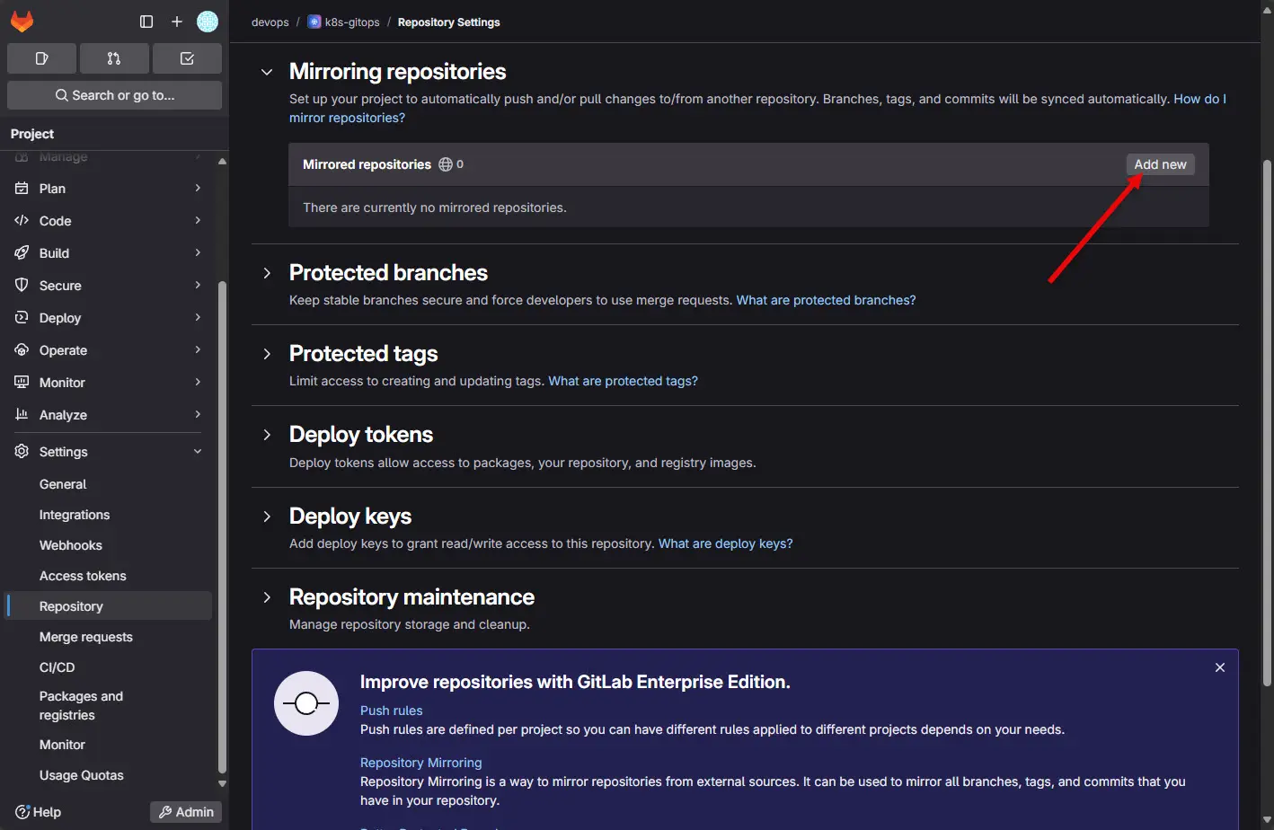 Click on the Add new button under the Mirroring repositories.