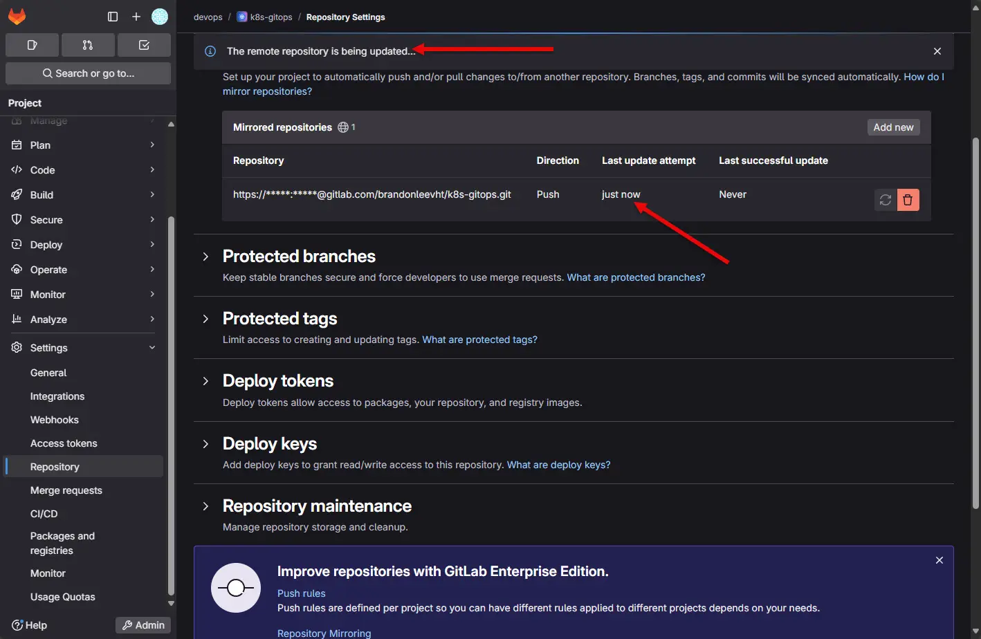 - Check the “Mirroring repositories” section for status