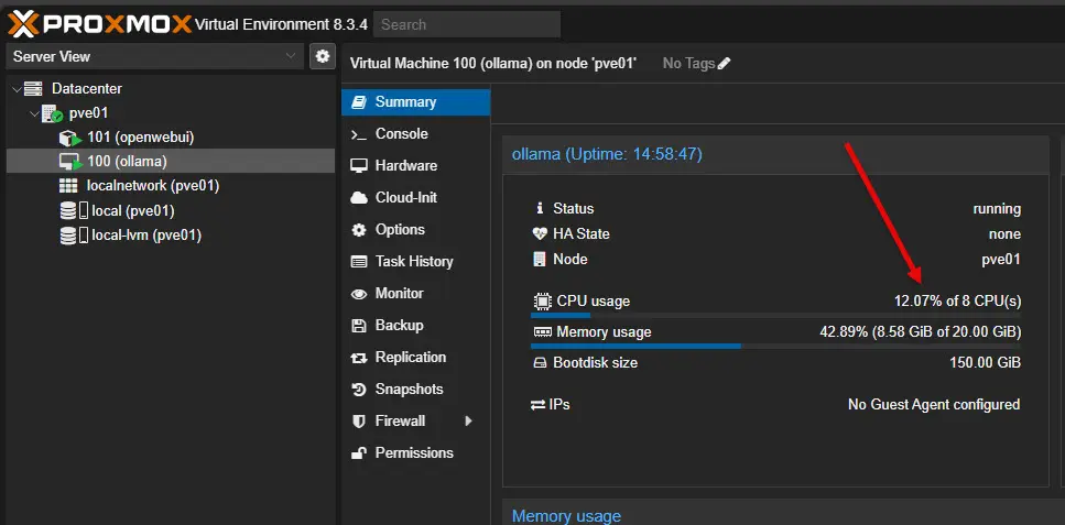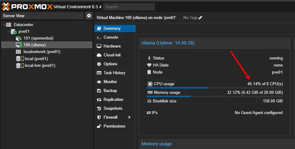 In the Proxmox web UI, this is what I saw with the virtual machine when a chat query was initiated. With 8 vCPUs carved out of the Ryzen 9 7945HX processor, I saw roughly 45% CPU usage in addition to the 60-65% CPU usage.