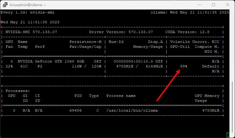 For instance, the below tests are running with gemma3:4b. Running the command below to look at GPU performance: