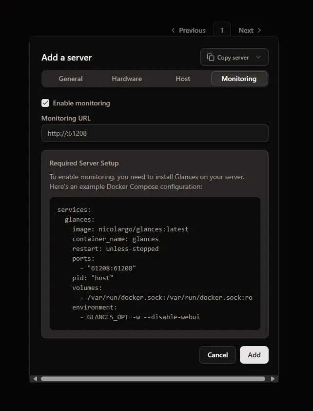 You can use Glances for monitoring a remote server. When you add a server and go to the monitoring tab, you see the Docker Compose code listed that you need.