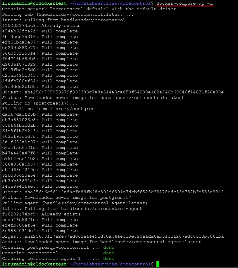CoreControl’s latest version uses a multi-service architecture with separate containers for the web UI, background agent, and a PostgreSQL database. Here’s the recommended docker-compose.yml configuration from the official repository: