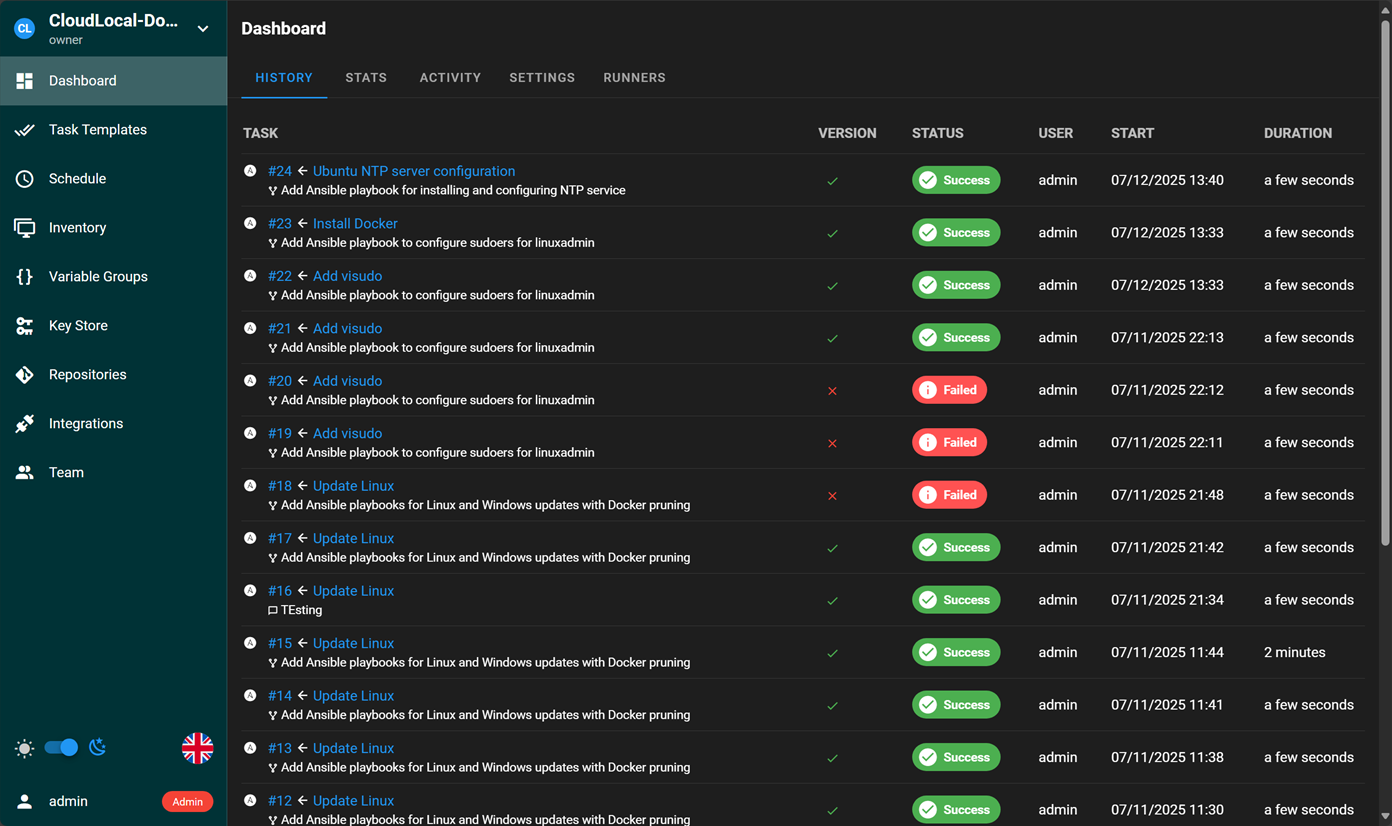 Semaphore is a great tool that also includes other enterprise-like features. These features include things like role-based access control for teams and audit trails. This allows you to have visibility on all activities, including projects, task runs, etc. Also, you get notifications that can be triggered (for failures only to email), but also ALL notices (successes and failures) to Telegram or Slack.
