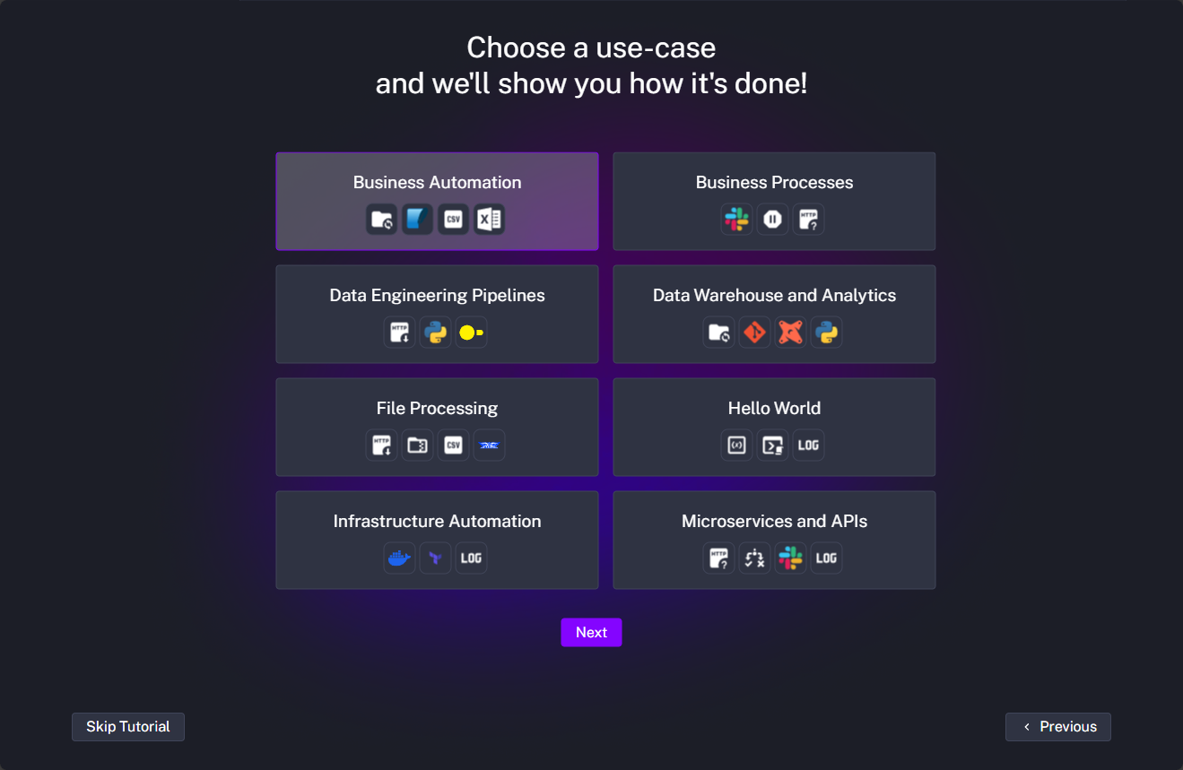 Below, you can see when you are first setting up Kestra, it helps you choose and build your first project based on use-case. You can choose: