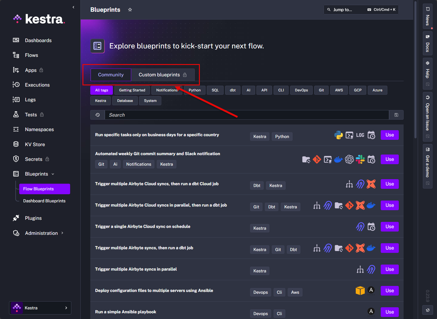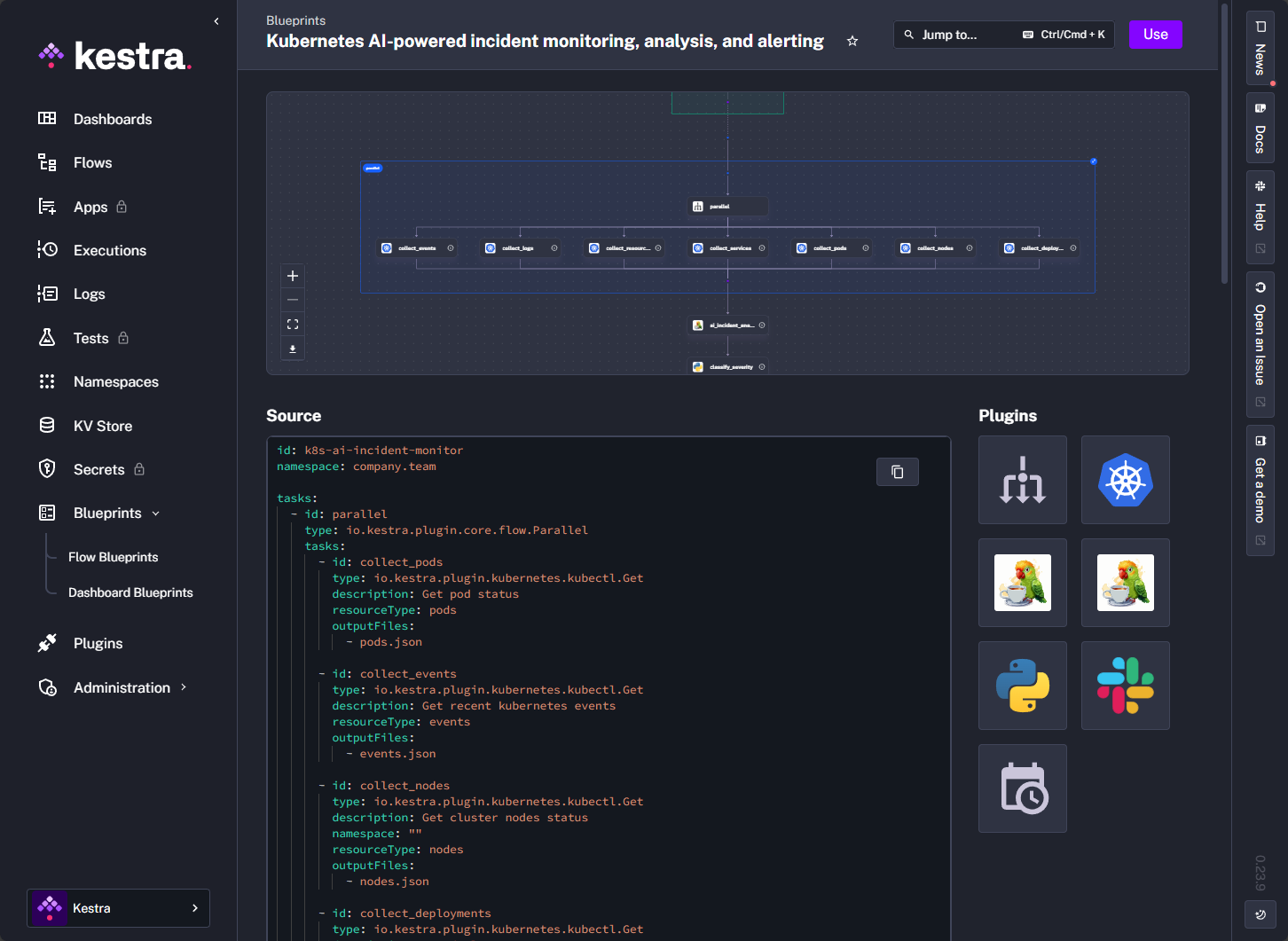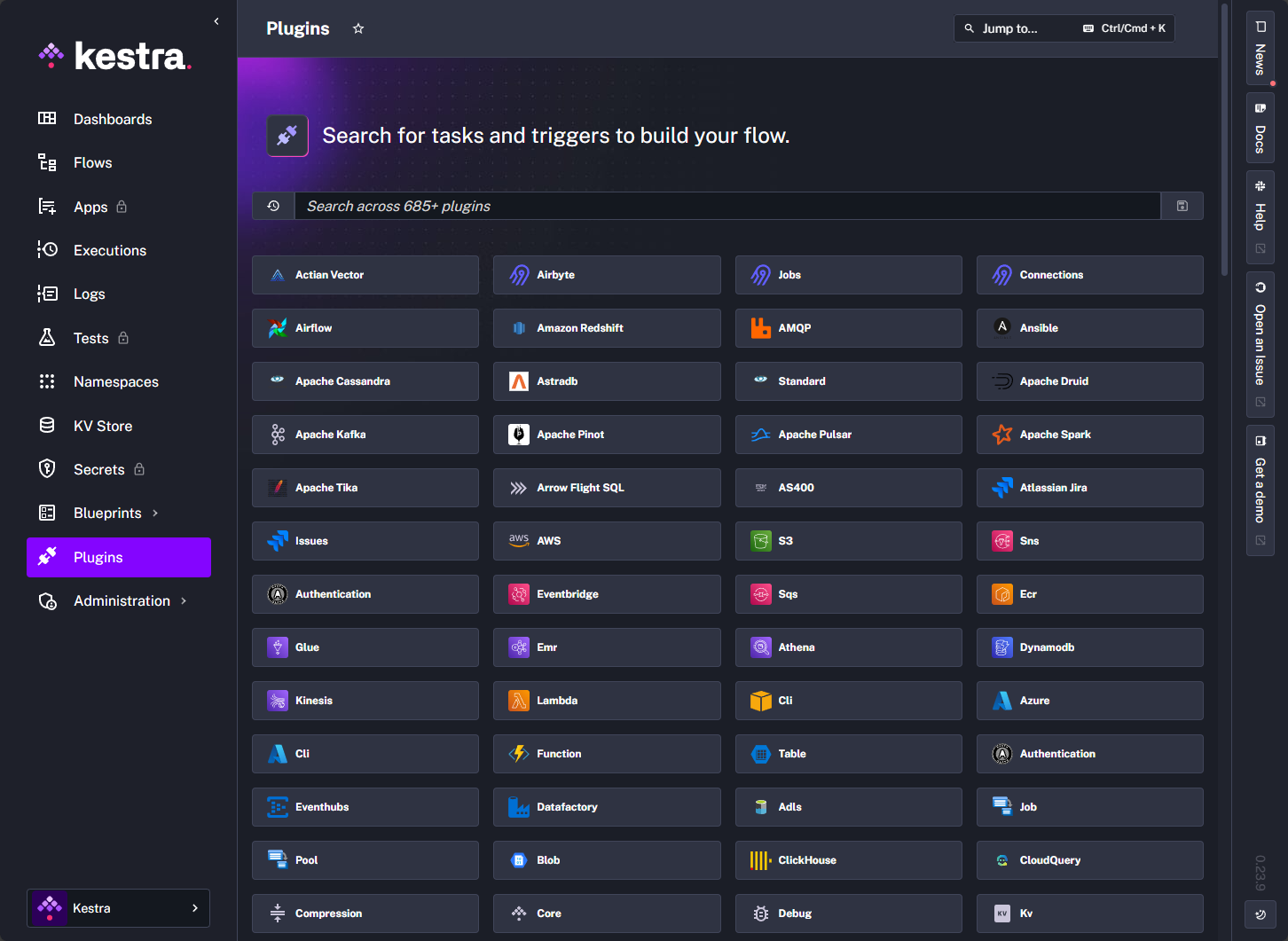 There are a couple of things that I really like about Kestra when it comes to making automation easier, and those are plugins, and Blueprints. Plugins are as they sound – extensions that allow you to integrate with popular services or other solutions via their available APIs.