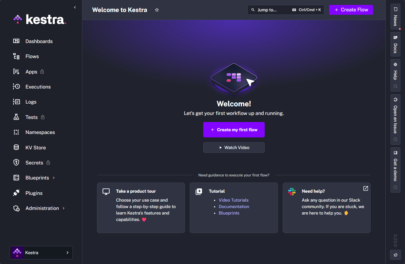 In my case, I found myself managing too many individual Ansible playbooks and cron jobs. Kestra helps me pull it all into one orchestrated pipeline, making automation more observable and reliable. Below is a look at the Kestra dashboard after installation.