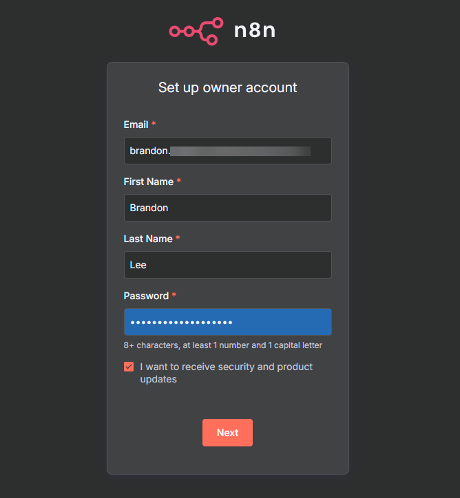 After bringing up the container, you will see the Set up owner account. Here we enter a valid email address, first name, last name, and create a password. You can opt-in to security and product update messages as well.