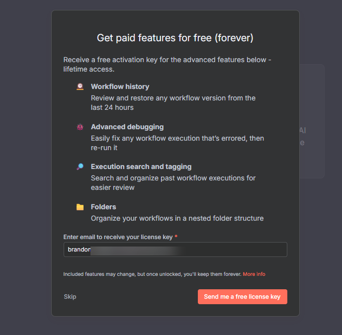 Also, something I think is pretty cool is that you can get paid features for free (forever). This means you will get a license key that will allow you to have the things you see in the dialog box, like advanced debugging, which is great. Just enter your email address in the bottom of the form and click the Send me a free license key.