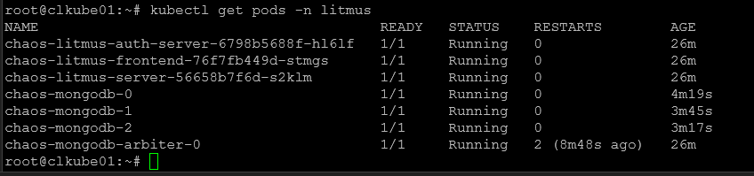 helm install chaos litmuschaos/litmus --namespace=litmus --set portal.frontend.service.type=NodePort