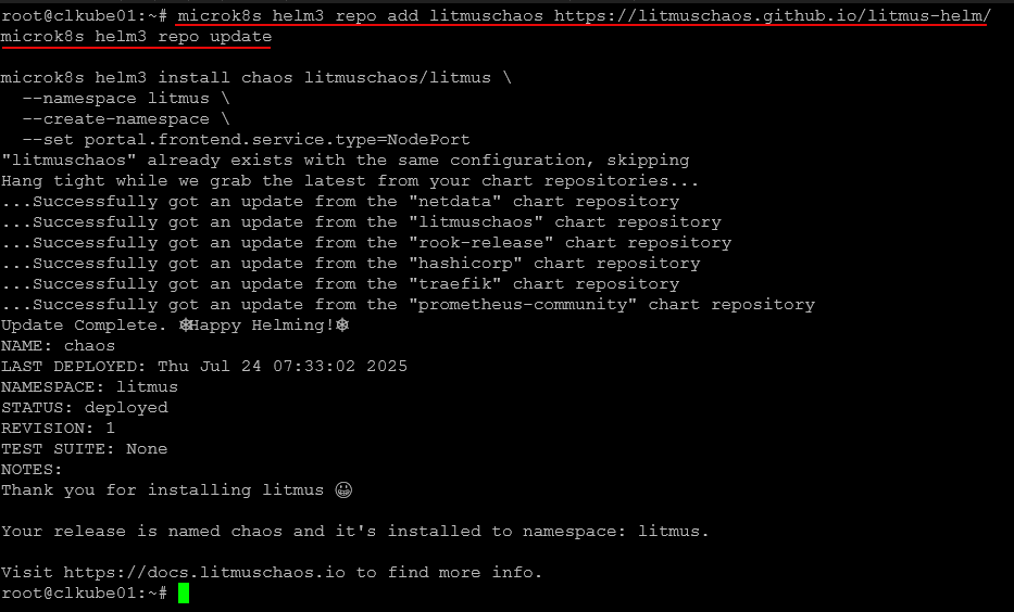 helm repo add litmuschaos https://litmuschaos.github.io/litmus-helm/