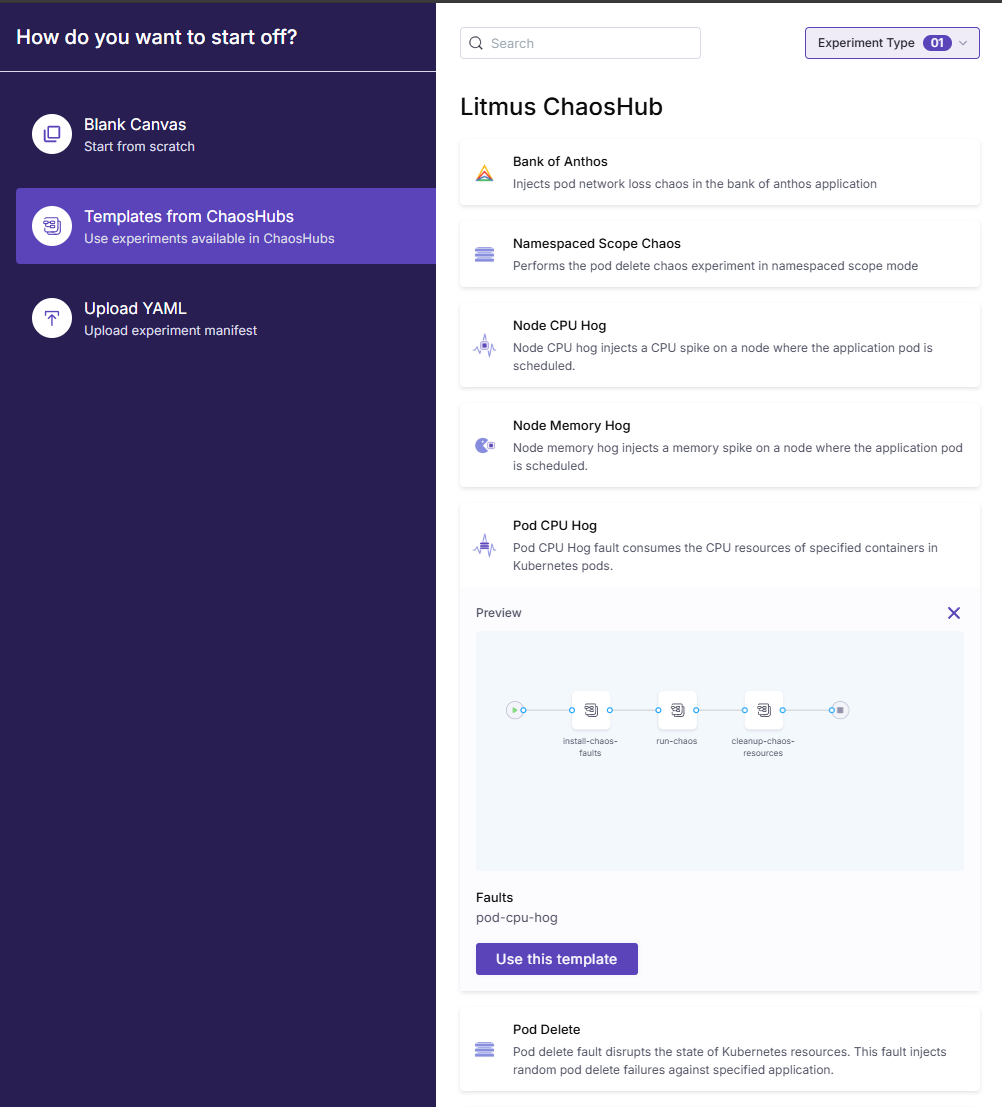 - ChaosExperiment – this is a template that packages a specific fault injection (e.g., CPU hog, pod delete), its permissions, defaults, and even allows you to bring your own tooling (BYOC).