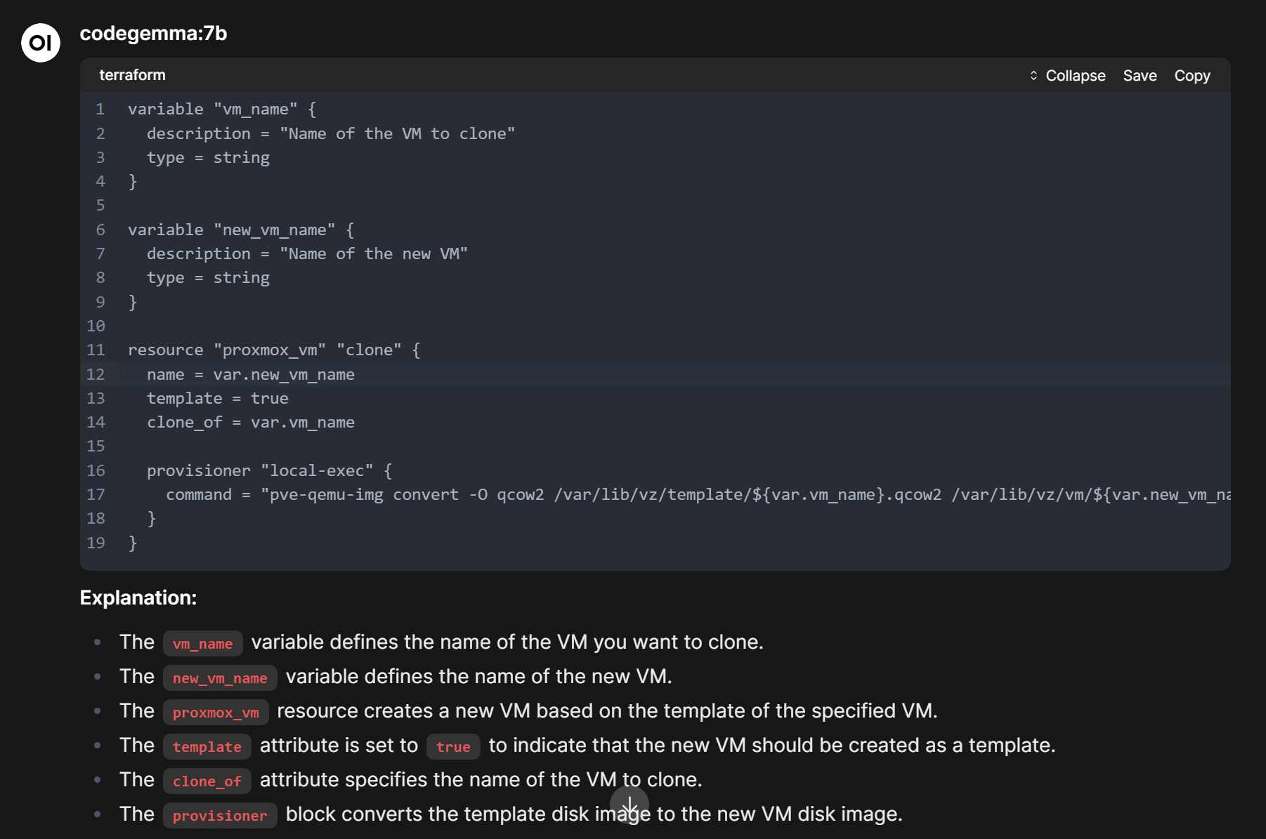 If you are looking for a great model for coding and DevOps’y tasks in the home lab, codegemma is also a great option. It is more focused on coding than gemma 3 which is a more generalist model. Take a look at this Terraform code I generated with codegemma: