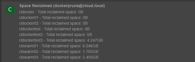 This runs every Sunday at 3:00 AM and prunes stopped containers, unused networks, dangling images, and unused volumes.