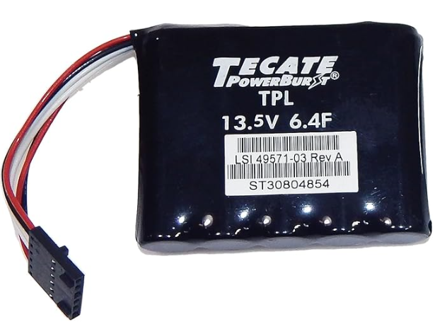 For RAID controllers, there is also something called a BBU or Battery Back Up unit (shown below) for your controller. You plug this in and it provides enough power for the RAID controller to flush pending writes to disk after a power failure, helping to prevent data corruption.