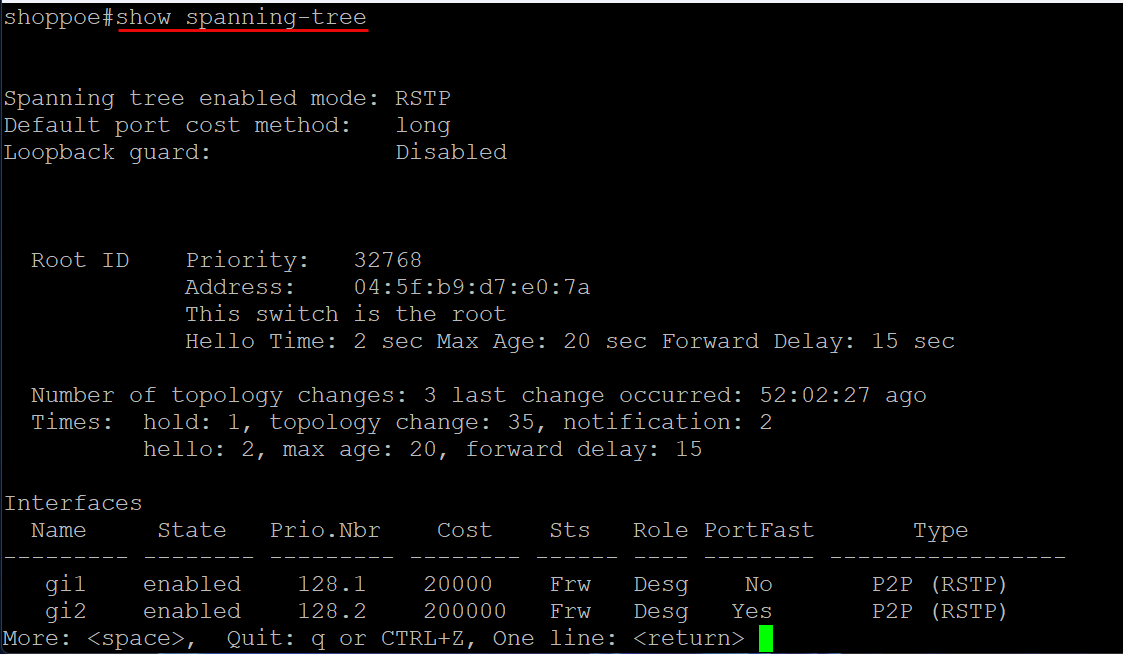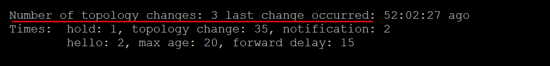 Below is a pretty normal output: 3 changes have occurred 52 days ago. So we don’t have a large number of topology changes and the last change was days ago. An active loop will show that you have changes just a few seconds ago and the number of changes will continue to increment.