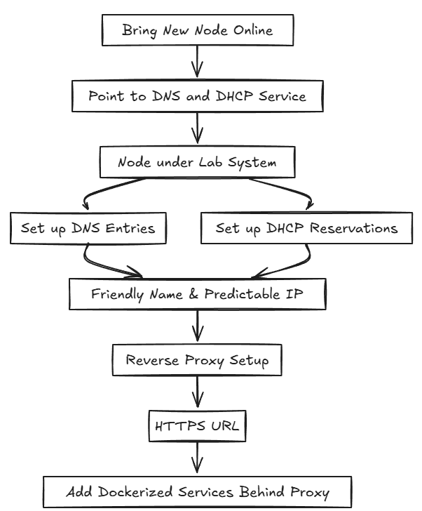 When I bring a new node online, I start by pointing it at my DNS and DHCP service so it falls under the same system as the rest of the lab. Then I set up DNS entries or DHCP reservations for it so that it has a friendly name and predictable IP. Next, I make sure I get a reverse proxy stood up with an HTTPS URL so that I can start adding my Dockerized services behind it.