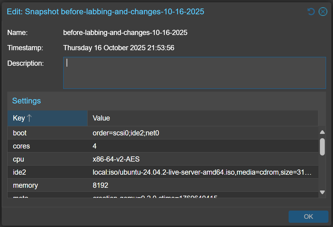 Before any major change, I create a snapshot. With snapshots in Proxmox, you can’t have spaces. Note the other requirements: