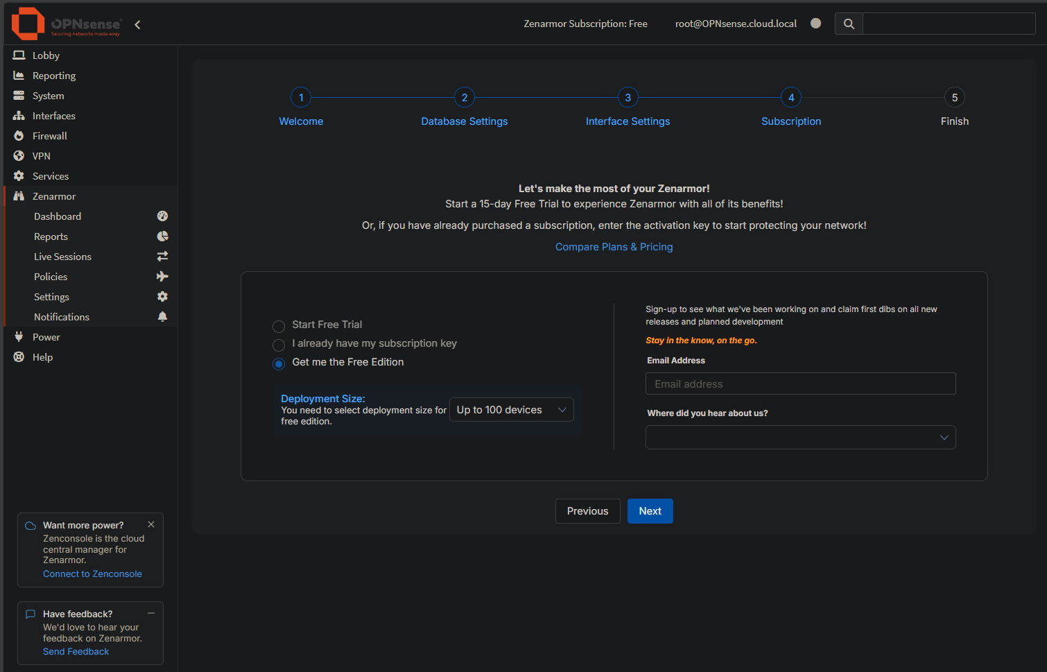Once you install the modules, you should see the Zenarmor menu now listed. When you click it, you will see the following 5 step wizard. The first step is just agreeing to the EULA.
