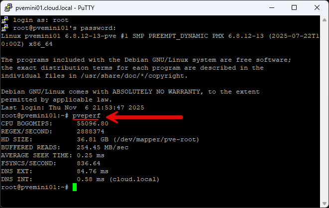 With this command, you can get a clear snapshot of performance characteristics of your PVE node. This can be helpful if you are comparing storage backends, testing out new NVMe storage, or “burning in” a new hardware configuration in the home lab.