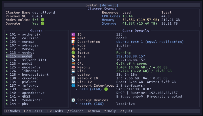 This is a new tool that is called PVETUI. It is a minimalist text user interface (TUI) for Proxmox VE server. It lets you monitor and control your PVE environment from the command line and provides an ncurses-style dashboard that displays various aspects of the environments. These include your nodes, VMs, containers, and other things like resource metrics (CPU, memory, disk, network, etc).