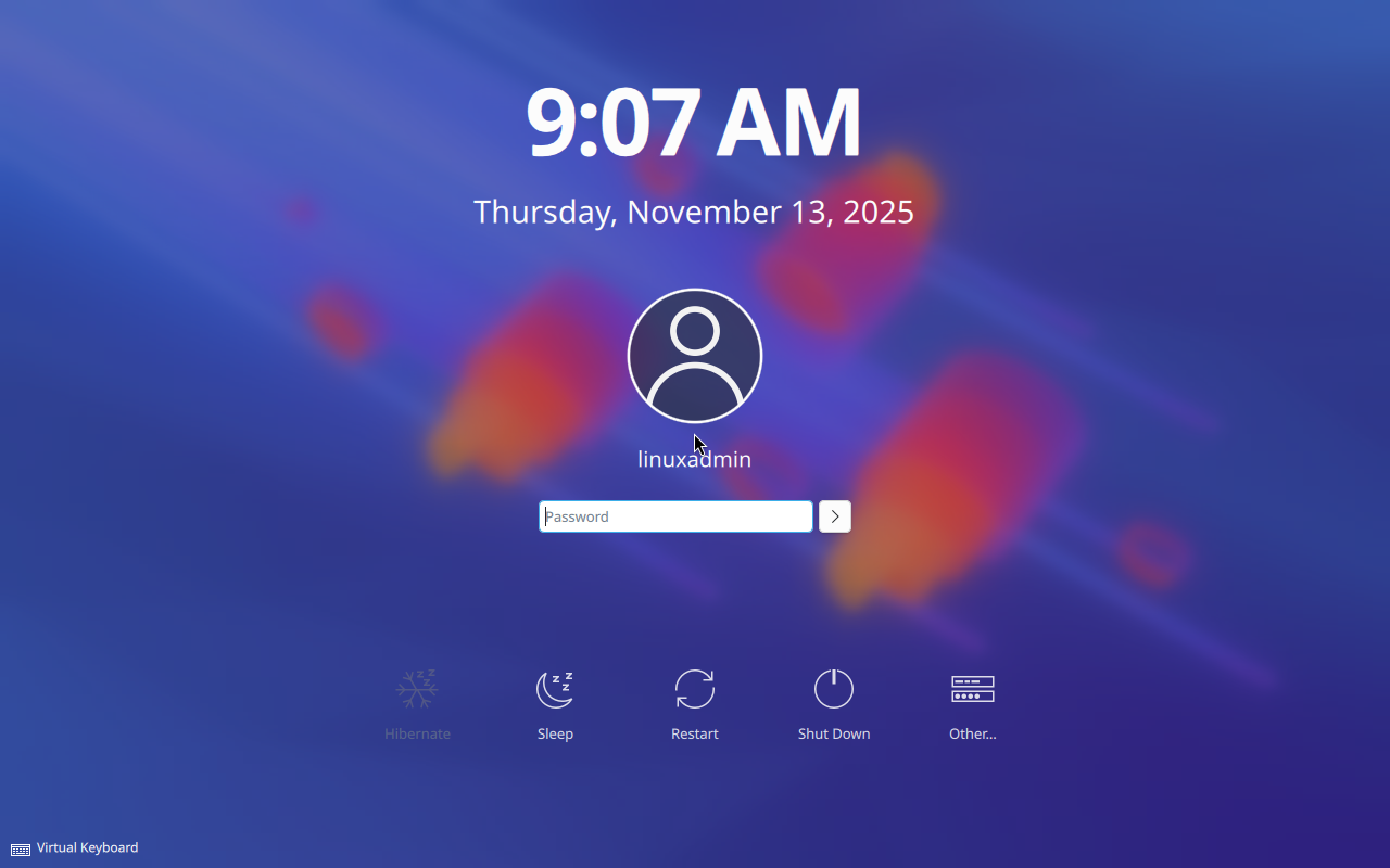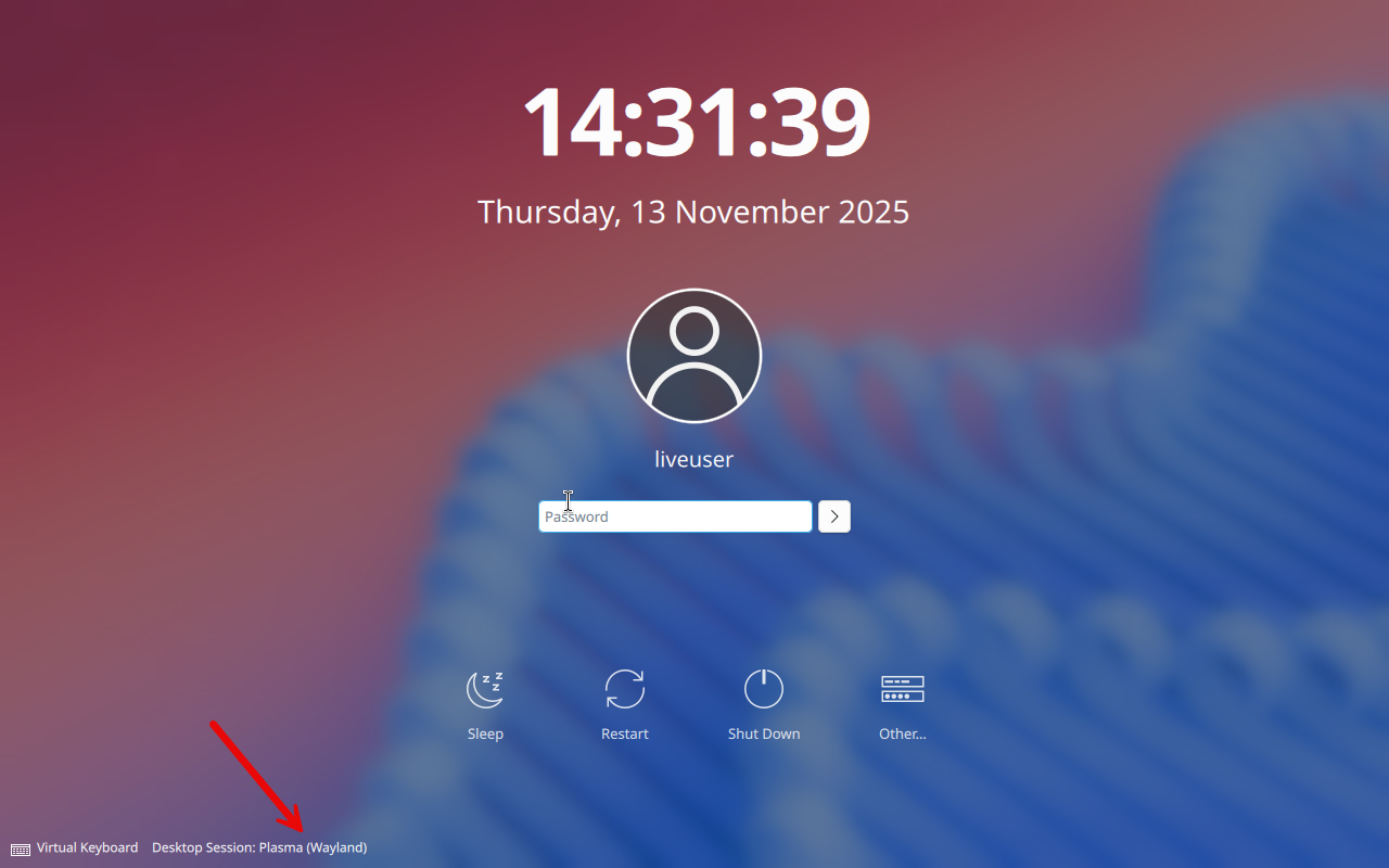 It boots into a Live installer. Here is a quirk. None of the passwords that I found for the “liveuser” online, worked. Some said it was blank, others said it was “root” and others, something else. However, there was a thread on Reddit that detailed that you need to switch to Wayland in the lower left hand corner and then the liveuser login works. Indeed it worked for me! Switch to Wayland, and then you can login with a blank password.