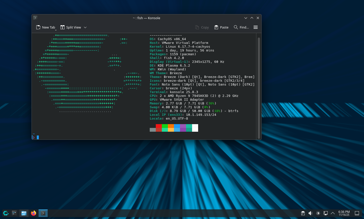 If you are running a virtualized environment on top of something like Proxmox or ESXi, Cachy Linux can form the base of your Linux template because it installs quickly and doesn’t require a lot of resources. It also supports QEMU and VMware hardware out of the box.