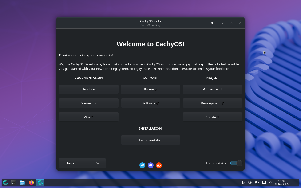 This will log you into the live installer. The “Welcome to CachyOS” screen will launch. Then just click the Launch installer button.