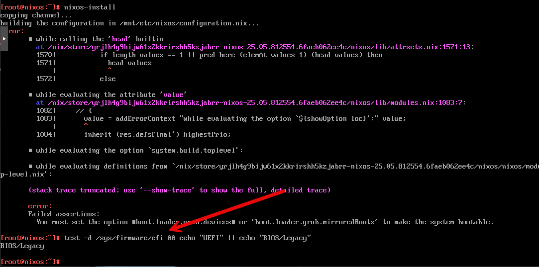 Since I didn’t configure the NixOS VM in Proxmox with the right UEFI settings, I received the error below. I ran a quick test to see if it was UEFI or BIOS/Legacy. Sure enough, I had missed that detail: