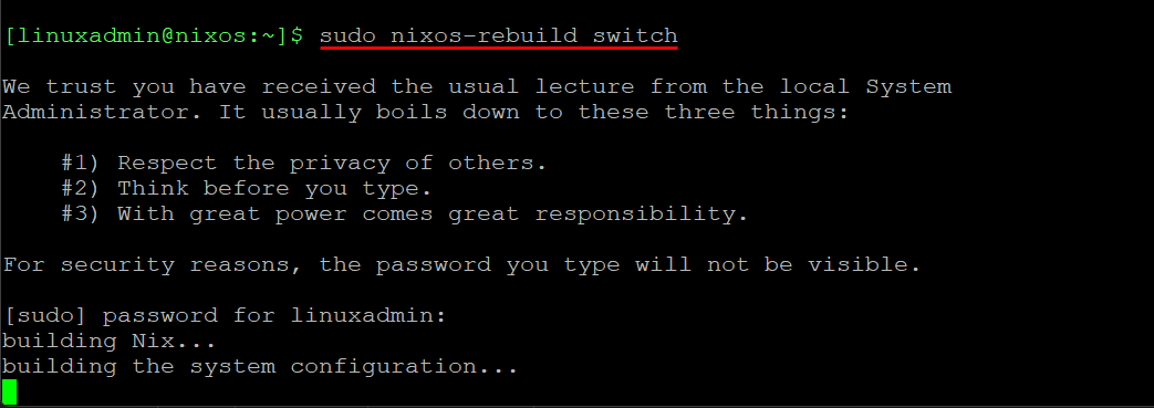 After you update your configuration.nix file, you need to rebuild your nixos configuration. How do you do that? Well, it is fairly simple. Just use the following command:
