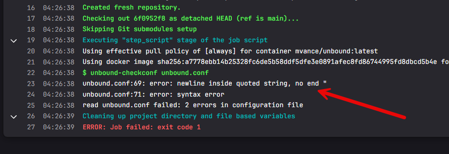 Then, Unbound wouldn’t start. However, with Git and a CI/CD pipeline, I can check the config file with the built-in Unbound config checker and make sure the syntax is good before we put the file in place.