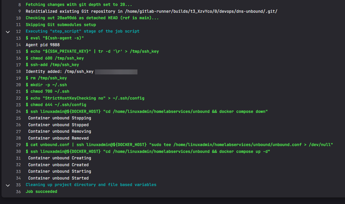 This allows us to have the private key stored as a pipeline variable and then the docker host is something we can also store as a variable. Then we just down the docker compose stack for unbound, copy the new file in place and bring the stack back up again.