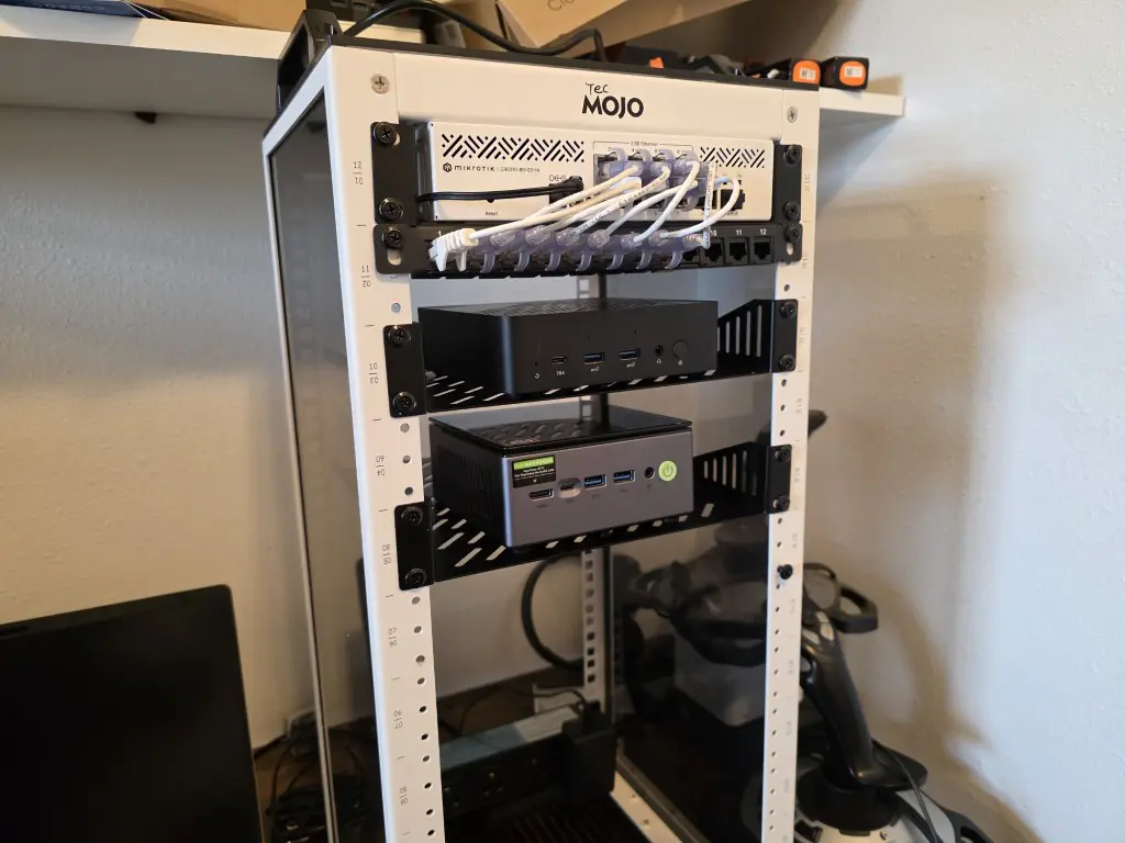 The Tecmojo 10 inch rack and other vendors like Geeekpi will usually give you a couple of shelves depending on which 10 inch rack you purchase. But, most likely you will need more, especially if you spring for the 12U variant like I did. The 2 rack trays will only get you covered for around a third of your U space. I am currently waiting on 4 more trays to house additional hardware in mine.