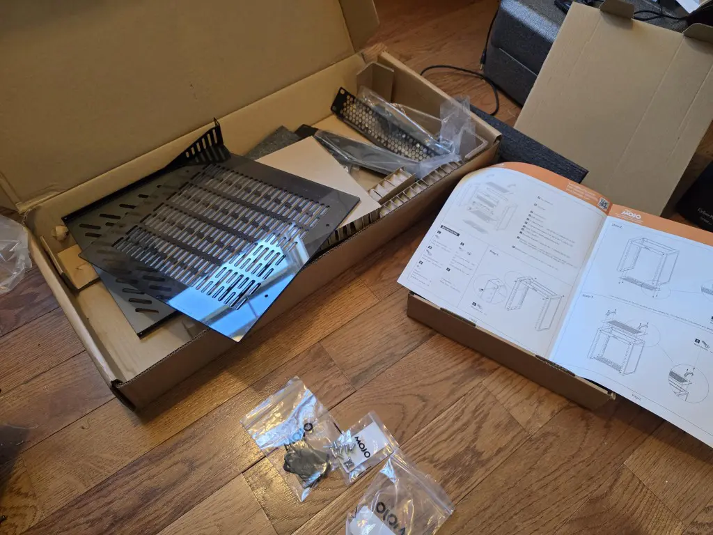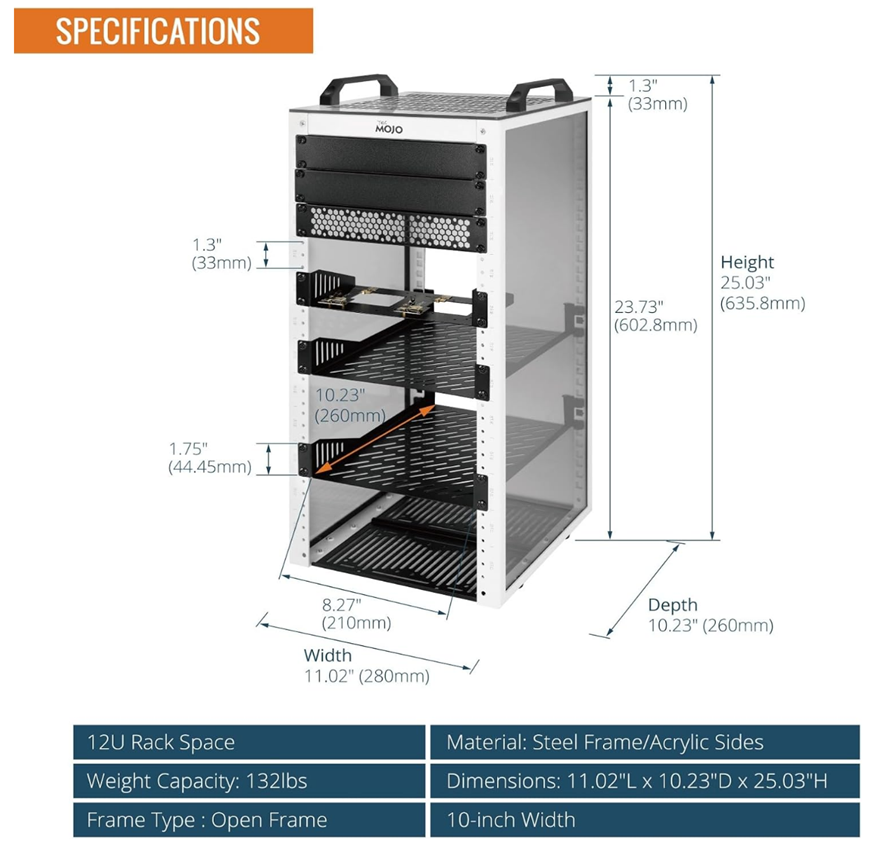 The Tecmojo 10 inch rack was packaged well and easy to put together. Everything was labeled, including the screws in individual bags with letters that were referenced in the assembly instructions. The metal parts of the rack felt quality and had a powder coating type finish to the paint. It came with 2 rack trays, an SSD/external drive tray and two blank inserts, one that is perforated and the other is solid, and plexiglass sides and top.