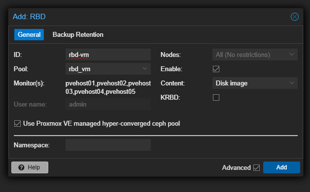The final bit that we have to do is actually adding this pool in the GUI for each host. Navigate to Datacenter > Storage > Add > RBD. You need to set: