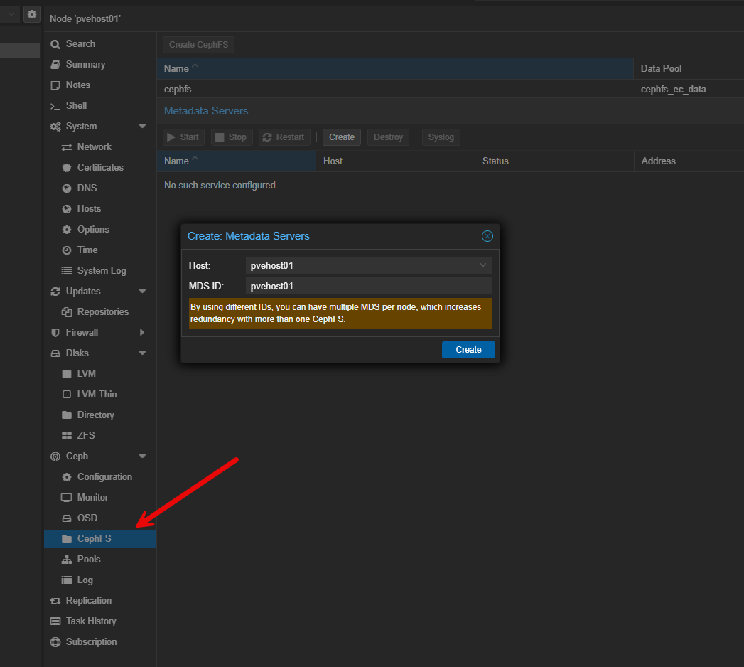 After you create your CephFS pool, you need to add metadata servers which is required for CephFS. You need two servers, an active, and a standby. Just add a couple and Ceph will take care of designating which one is active and which is standby.