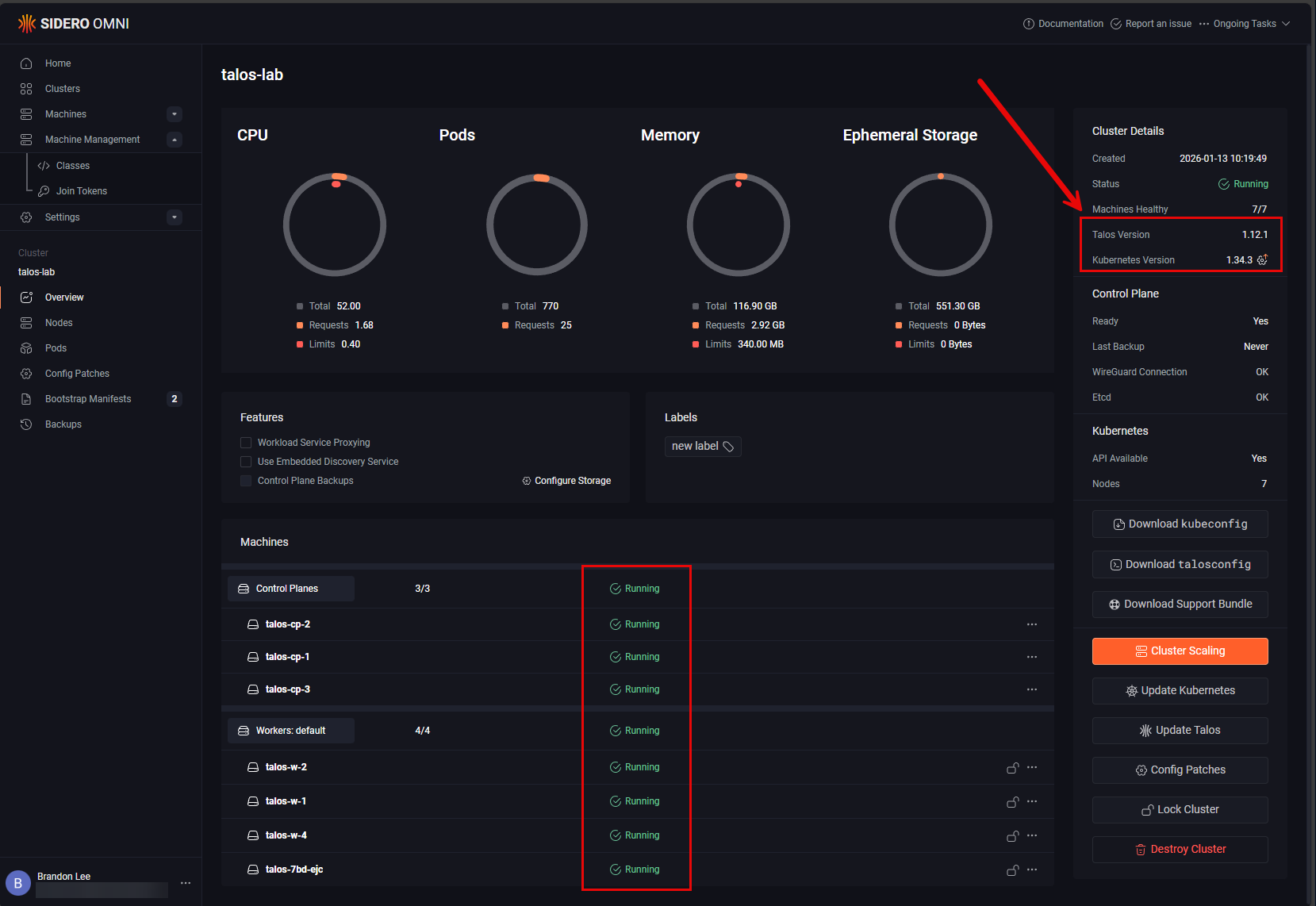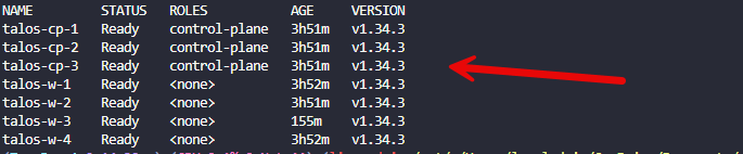 After getting the cluster up and runniing there were a couple of other things I did like upgrading the version of Talos Linux it used (went from 1.11.5 to 1.12.1) and also upgrading the Kubernetes version to 1.34.3 from .2). I didn’t upgrade to 1.35.0 as of yet. Letting the dust settle there a bit more.